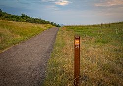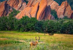 The Fountain Valley Trail winds through some of the most magnificent land in the park, including the Fountain and Lyons rock formations, historic buildings, and multiple habitats. These include habitats for various plants, mule deer, foxes, a variety of birds, and many more animals. You may even see a golden eagle soaring over the hogback hunting small mammals, snakes or birds.