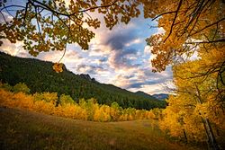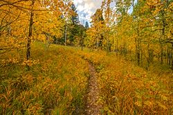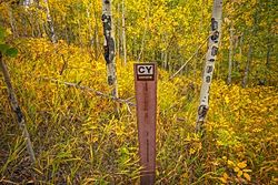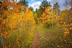 This ~1.5 mile moderate out and back trail connects the west side of the park to the Frazer meadow in the interior of the park. This trail starts with through an aspen forest/meadows before it gets to a steep and rocky section, and then descends into Frazer Meadow It is possible to use this trail to form much longer loop routes.
