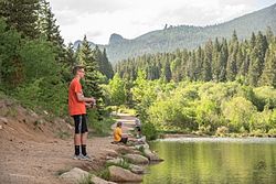 This moderate 3 mile loop trail takes you past a fishing hole in Golden Gate Canyon State Park. The trail starts at the aspen meadow campground and takes you past Dudes Fishing Hole. You can extend your hike using the mule deer or buffalo trails.