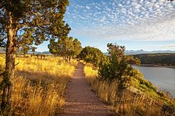 The Mears Bay trail is a 1 mile out and back trail along the eastern shore of the reservoir. This is a roughly level universally-accessible one-mile concrete trail that winds along the shoreline of Mear’s Bay in the Dutch Charlie area. Waterfowl such as Western grebe, Canada geese and great blue heron can be seen here during the more quiet hours of the day. Enjoy beautiful views of the San Juan Mountains reflected in the bay. It provides also provides access to an extended network of trails for those wanting a longer hiking experience.