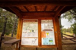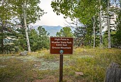 Grouse Mountain is a short 0.5 mile out and back trail that leads to the highest point in Mueller State Park, the 9,843 foot Grouse Mountain. Near the summit of Grouse Mountain there are great views to east and of Pikes Peak area and if you continue to the end of the trail, there are great views to the south and west as well. This area does have many Aspen trees, so fall is a particularly nice time to visit.