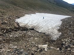 This difficult route (generally considered the standard route) begins at St. Mary’s glacier, where there is a small fee to park. From the trailhead parking for St. Mary’s Lake and Glacier, head up the well-worn trail/old roadbed to the lake. From the lake, a trail leads through willows to what’s left of the former “glacier.” You can choose from a few options here.