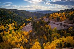Outlook Ridge intersects with three spur trails (#8 Raven Ridge, #9 Red Tail Overlook, and #10 Lone Eagle) that lead visitors to large Pikes Peak Granite outcrops that over look Rock Pond and Brook Pond. You can see for MILES to the south and west. The hike back to the parking lot is uphill, but totally worth it!
